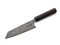-Design und das markante, von Hand geschlagene Hammering geprägt. Den ganzen Charakter der Messer erfährt man aber erst, wenn man sie in seiner Küche einsetzt. Die Messer haben eine sehr gute, ausgewogene Gewichtsverteilung, sind dünn ausgeschmiedet und sehr scharf. Der harte Stahl des Schneidkerns, geschmiedet auf ca. 62
