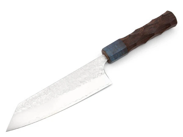 . Finish: Die Minamo-Serie hat eine Klinge mit 3 Lagen und einem ausgesprochen schönen Hammering, das die Optik der Klinge dominiert. Bevor die Klinge gehämmert wird, bearbeitet Yoshimi die Klingen-Oberfläche mit einem besonders feinen Schliff. Griff: Diese Serie bieten wir mit zwei unterschiedlichen Griffen an. Ein Griff ist aus italienischem Olivenholz, gewachst und achteckig (Oktagon) geformt. Der zweite Griff ist aus dunkler Wenge. oktagon. Beide Griffe vermitteln eine großartige Haptik und liegend hervorragend in der Hand.